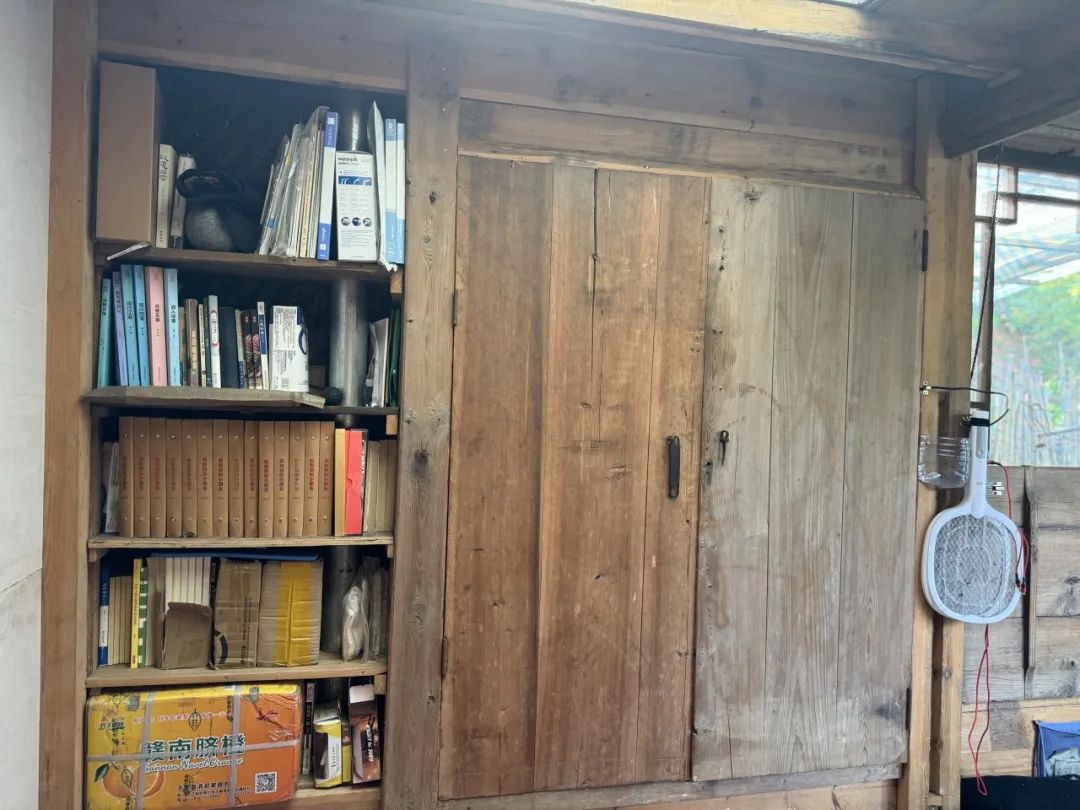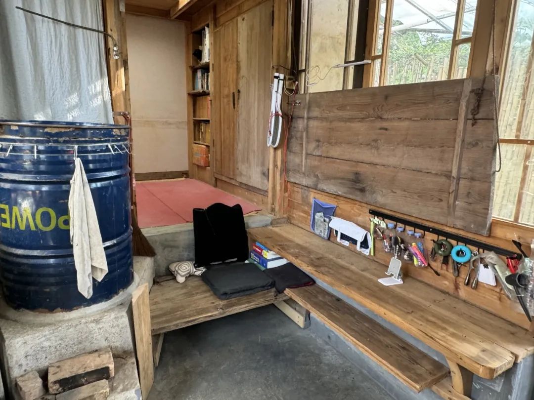 搞掂了通透,再对付狭小。用老谷仓建小房子是早就想好的,但是内部并不追求极致紧凑。大谷仓也称“六尺仓”,两米见方,其实内径1.95米,不到四平方。稍稍加宽,由1.95米变成了2.2米。考虑到收纳需求,又将右侧向外延展,就有了壁橱兼书架,放四季衣物,和我正在读的书。