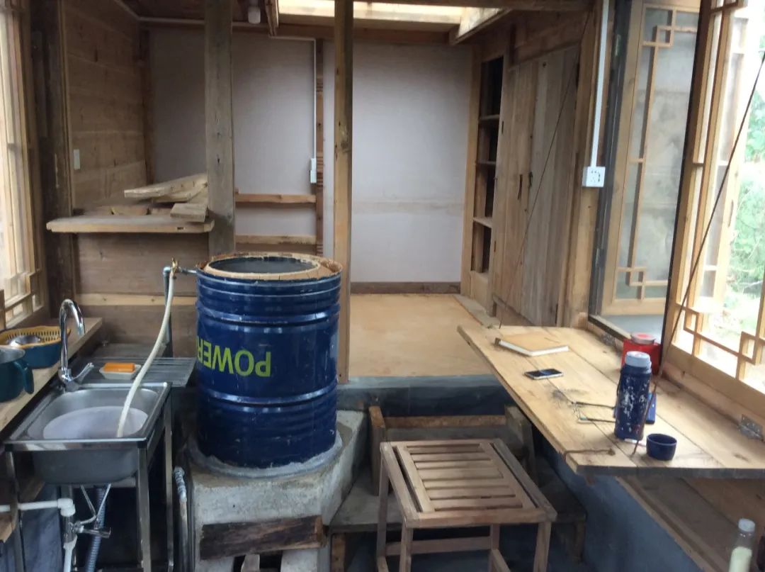 炕间1.2米的床,足够一人安睡,再错位摆下1.2米瑜伽垫,满足了垫上运动功能。灶间以火箭炉为中心,直径60厘米的烟囱散热器和进柴口靠南,连接炕间。围绕这个中心,东墙水盆下面放柴,窗台的长条是厨具水具收纳区,还放了一个袖珍的快煮杯。