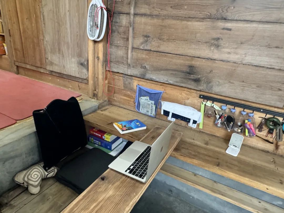 ●现在的桌子,坐垫摆在进出炕间的阶梯上,随时可以收起来,取出木板又可搭出电脑桌。