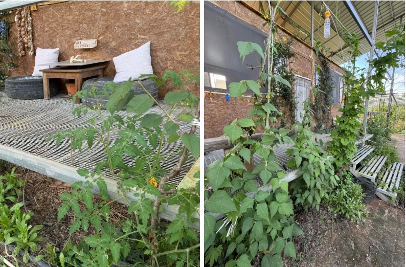 ●“一号”猪屎网下现在的样子,分别有香草、番茄、丝瓜、金盏菊、黄花豆、苦瓜、蒲公英、木耳菜、白菊、紫苏、南瓜。顺着搭好的草绳,爬藤植物会慢慢长上来,一直向上爬,形成一片 “食物的森林”。