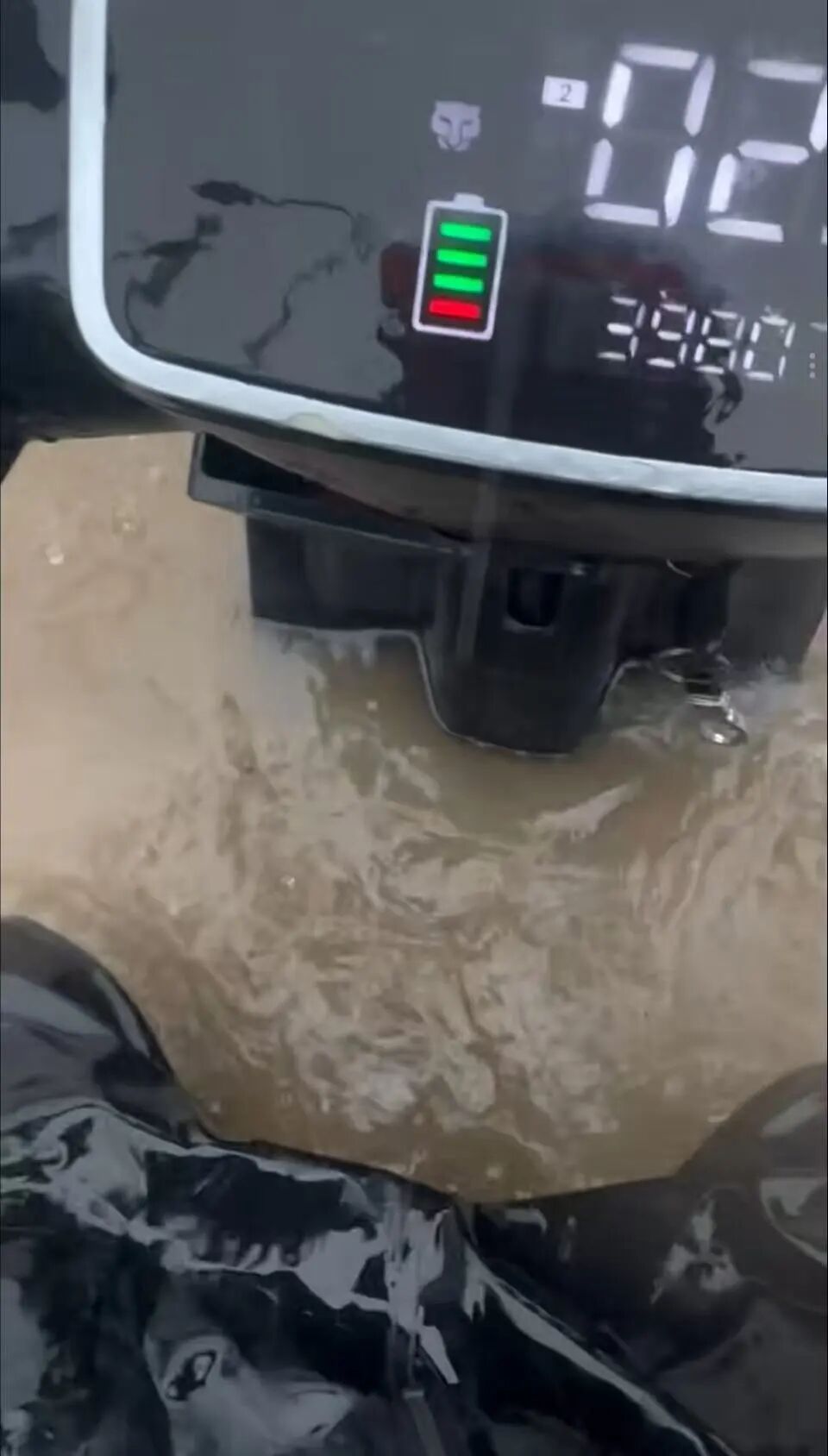 ●暴雨天,大雨漫过了外卖员的膝盖。图源:HE