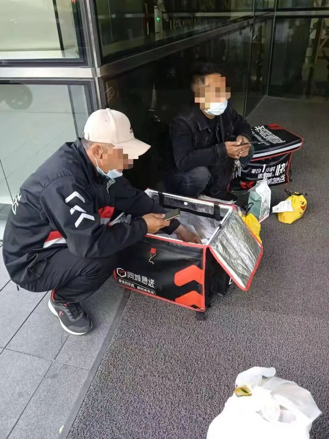 ●在写字楼等待打工人取外卖的骑手。摄影:玉阳