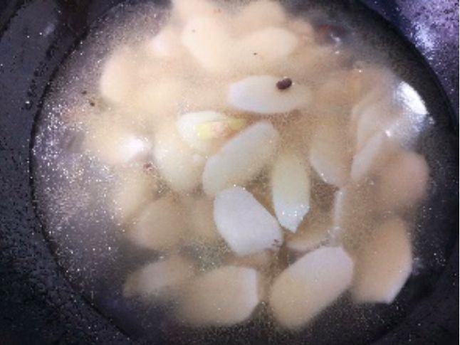 经过了这一步后,再用油爆香蒜末和廊田豆豉,加水后放入切成块的红芽芋焖煮至烂。