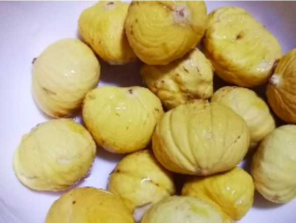 去皮板栗可以去超市直接购买。本地的板栗要中秋左右才能上市,剥去外壳的新鲜板栗,内膜比较紧实难以去除。这边有一个可以分享给大家的小诀窍:将板栗放入烧开的水中焖1-2分钟,趁热就能轻松剥去外膜啦。