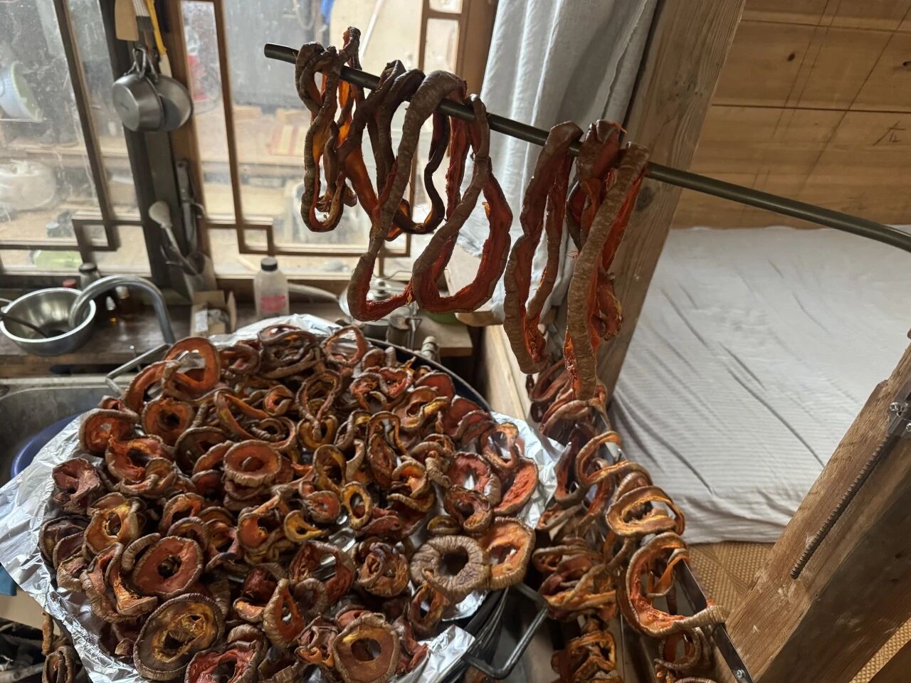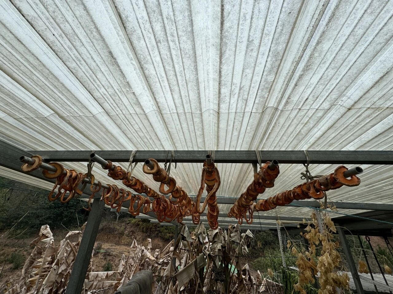 选大南瓜一次切了12个,一百多斤。忙活整整一天,把所有的南瓜圈都挂在毒日头下,十天左右晒干水分,体积也大大缩水。生南瓜圈晒到火候,刚好赶上这次降温,可以升火烤南瓜。