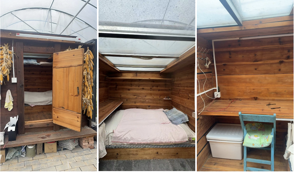 透明顶棚省下一些谷仓顶板,用卸下来的原装木板搭一个矮床,铺一个榻榻米垫,就是茶室。铺上被褥,就是一张床。出太阳的日子,开门就有一股热浪涌过来。