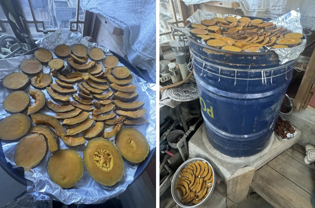 第一种,刚一降温升火就开始。南瓜切厚片,上锅蒸熟后摆在火箭炉上烤,烤干后再上锅蒸第二遍,继续烤。三蒸三烤的南瓜干,半透明,极甜,极香,有嚼劲,冬日零食最佳。