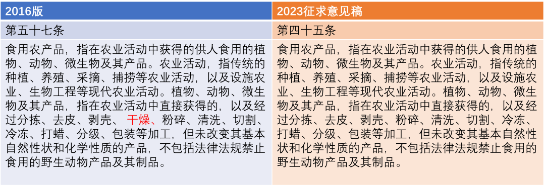 ●《管理办法》2023征求意见稿和2016版在对食用农产品的定义中,最重要的区别是删去了“干燥”一项,这意味着农民自产的干货无法直接销售,除非获得复杂、昂贵的食品生产许可。