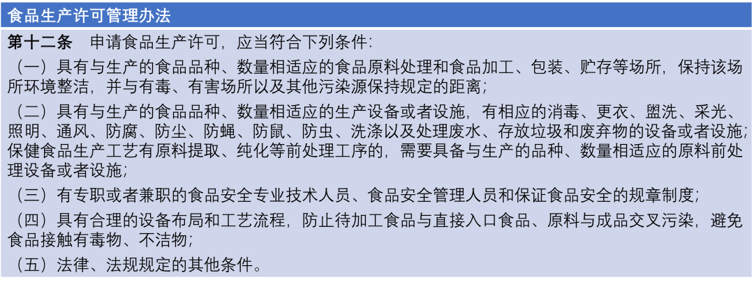 在我国,对于食品生产的监督是仿照工业的管理模式,凡是从事食品生产的,都需要获得资质,也就是大家在食品包装上会见到的以SC开头的一长串“生产许可证号”。这意味着生产者要符合下图中《食品生产许可管理办法》中的规定。