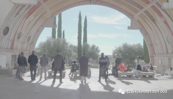 〇保罗·索莱里希望亚高山地的建筑能与周围环境构成一定的关系,而不是处于完全密封的状态。午饭前,居民们会聚集到穹顶下举行社区会议,在这个开放空间中商量与各自生活密切相关的问题。图片:纪录短片《亚高山地》截图