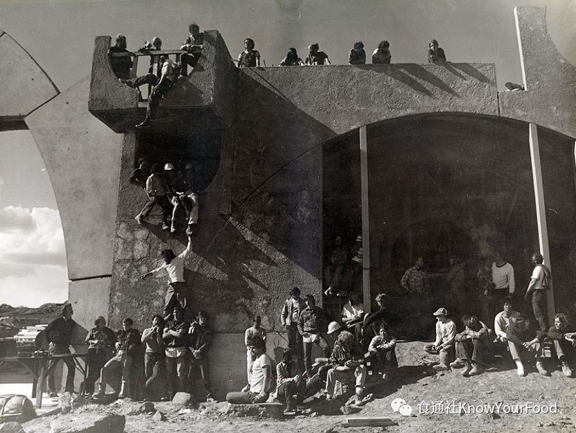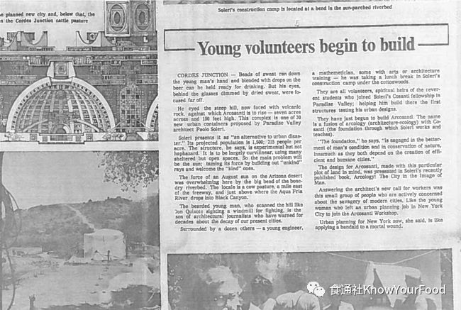 70年代的美国深陷经济停滞、环境污染、政治动荡的泥潭,许多年轻人都不想轻易把自己的未来托付给政府安排或置于资本的控制中。在这样的背景下,索莱里在沙漠中的理想主义实践一下就吸引来了建筑系学生甚至全国的目光。在建设的头几年,就有200多个志愿者无偿参与到建设中去。这个沙漠中的未来之城,竟然还就真的这样一点点靠人力盖了起来,引来许多媒体的关注和报道。