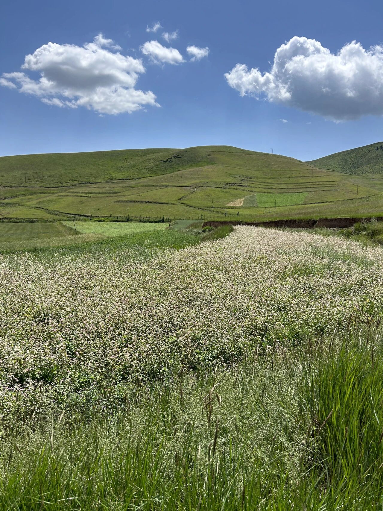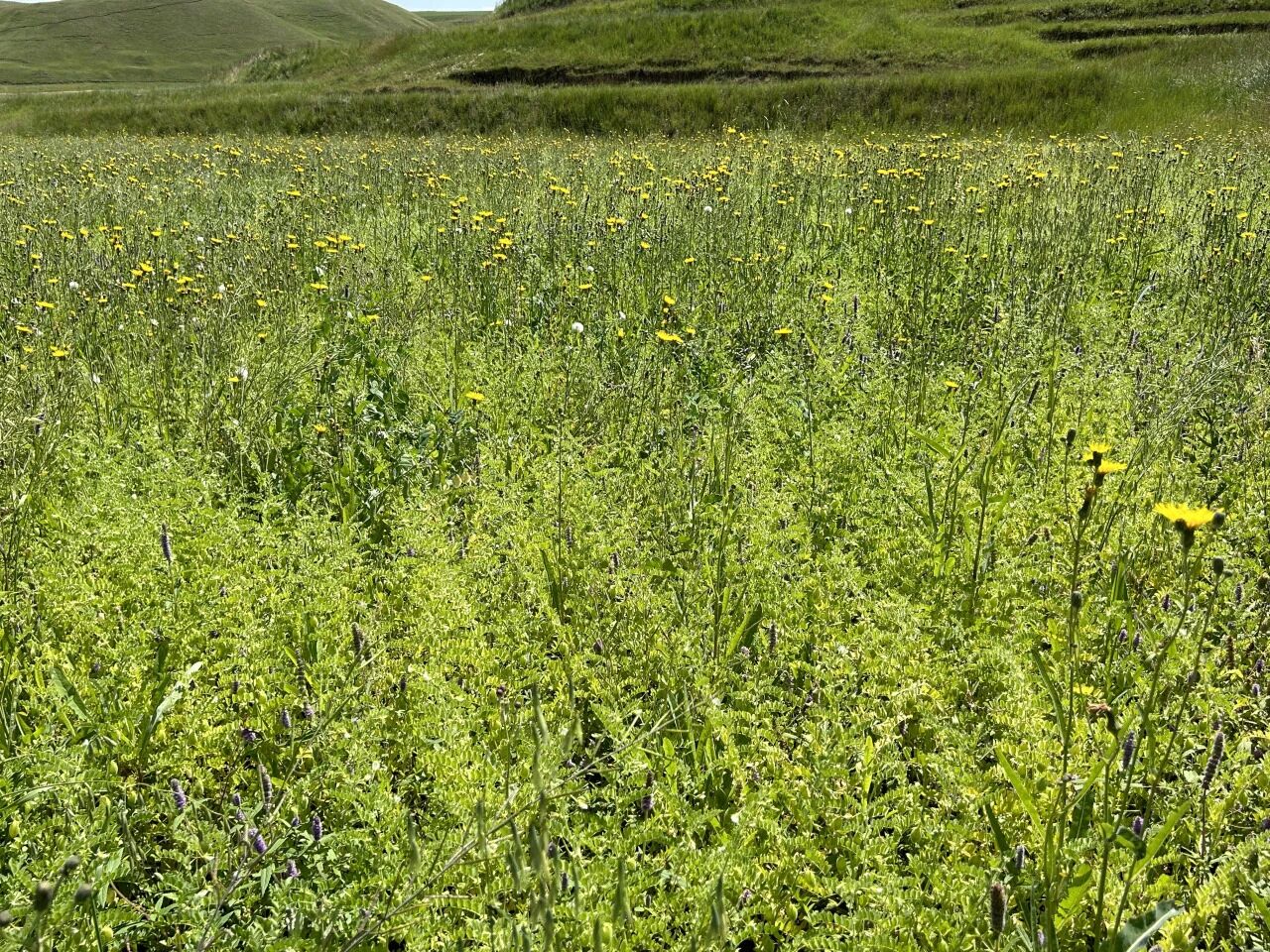 花花在天祝基地种植鹰嘴豆、亚麻籽,也轮作土豆和荞麦。我们发现,在一片粗壮、繁茂的荞麦下,还“藏”着一层土豆苗。这本来是今年铺上地膜、认真播种的一块土豆地。但去年倒伏的荞麦漏了一地的籽,反而喧宾夺主,现在,野蛮生长的荞麦长势却已经超越人工播下的土豆。