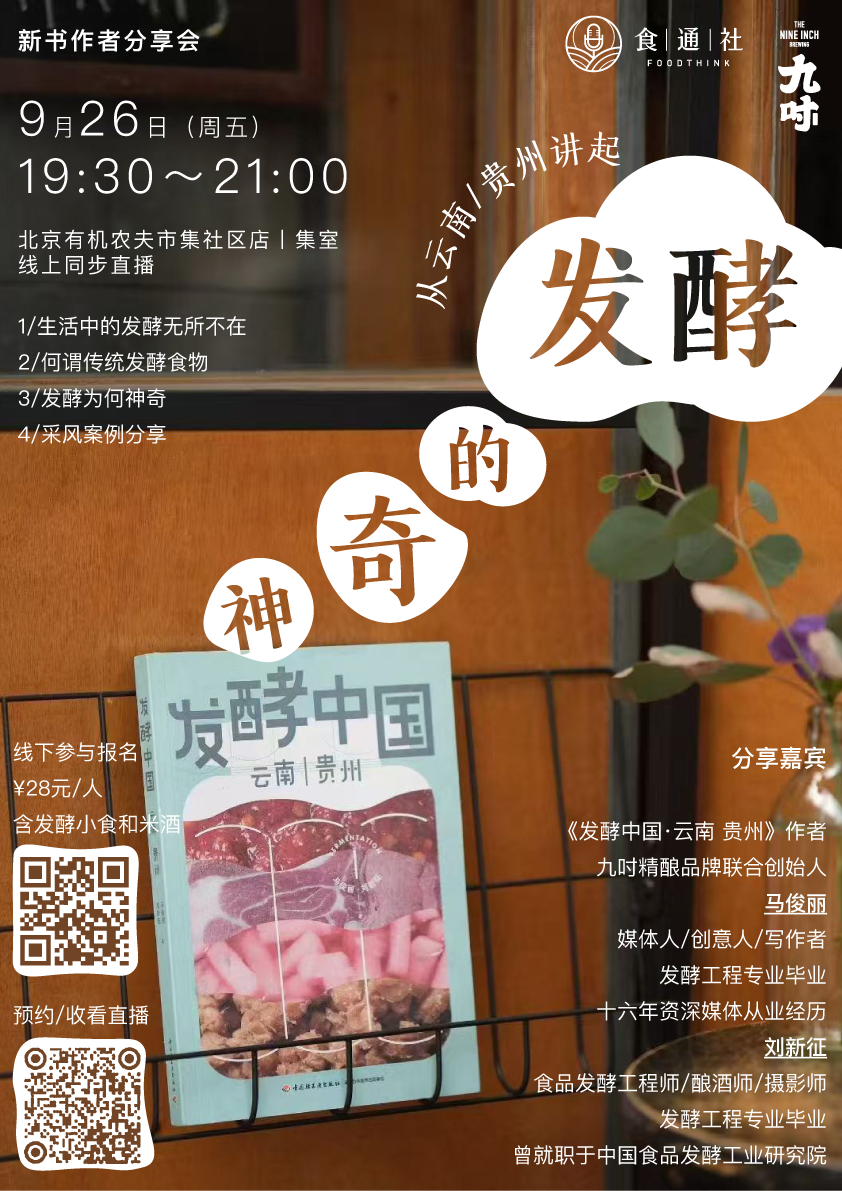 9月26日(星期五)晚19:30,《发酵中国·云南贵州》的两位作者马俊丽和刘新征将带着新书,在北京三元桥·集室和大家一起分享他们的云贵发酵之旅,以及发酵如何给予日常饮食更多的启示:◦ 生活中的发酵无所不在