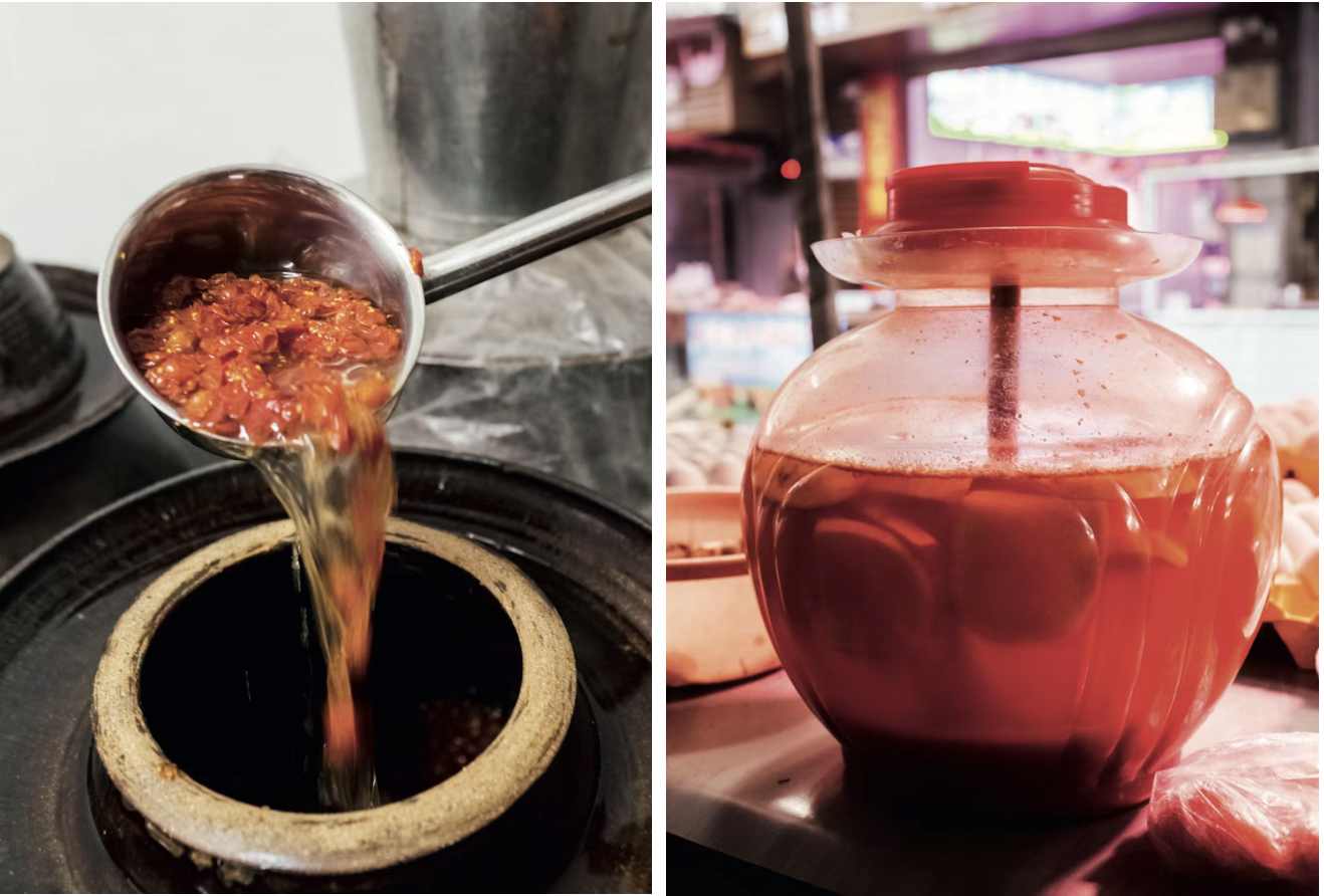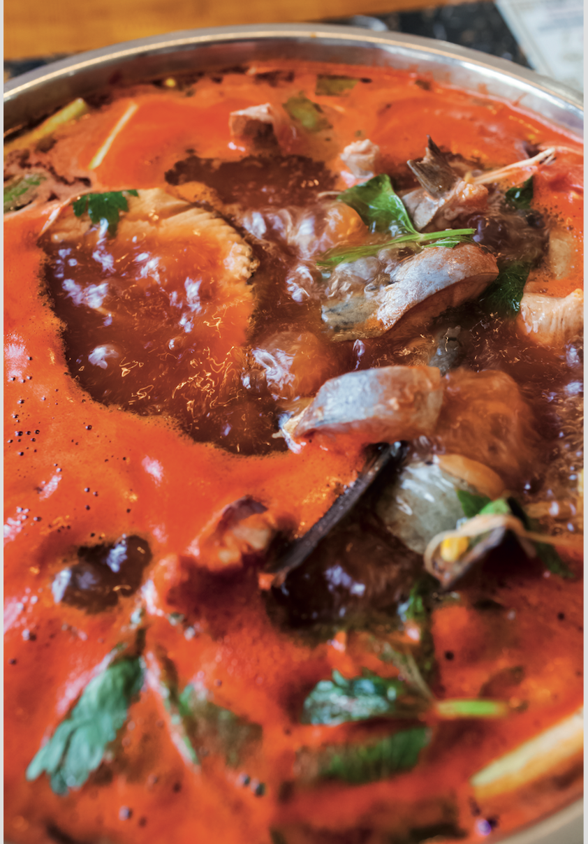 与白酸汤不同,红酸汤的制作与当地的气候条件和农作物收获季节密切相关。九月开始,红海椒、小米辣陆续进入成熟季节,也到了制作红酸汤的好时节。理想的红酸汤,由本地的毛辣果(野生番茄)熬制,这种番茄果肉多、紧,酸味足够。配上盐、酒糟、辣椒等入坛自然发酵,等上10~15天,就可以开盖了,开启坛子时,一股馥郁的发酵果香扑鼻而来。虽然叫作酸汤,其实并非简单的酸,而是丰富、多层次的复合味觉体验。它不像水果酸那么锐利,也不像醋酸那么单薄,那酸味像是悠长的呼吸,深深浅浅,混合着鲜美的肉,最终落胃。在贵州只要是吃带有酸汤的美食,木姜子油的蘸水堪称灵魂伴侣。木姜子油也叫山苍子油、山鸡椒油,是一种特种香料。发酵过的番茄汁和米汤构成了酸汤鱼汤汁浓厚酸爽的底味,加上略带刺激口感的木姜子油,使酸汤具有了丰富而完整的口感,形成天衣无缝的味觉搭配。