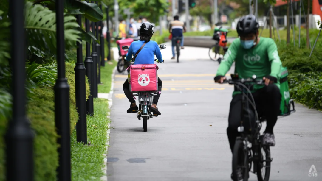 ●疫情下的新加坡外卖员。数据显示,新加坡人平均每月在送餐服务上的支出从2019年的67.54新币(约合人民币365.99元),增加到了2022年的108新币(约合人民币585元)。图源:CNA(亚洲新闻台)