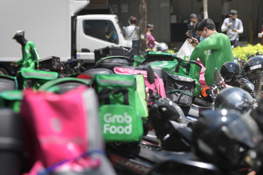 ●新加坡,GrabFood的外卖员正在送餐。图源:《海峡时报》