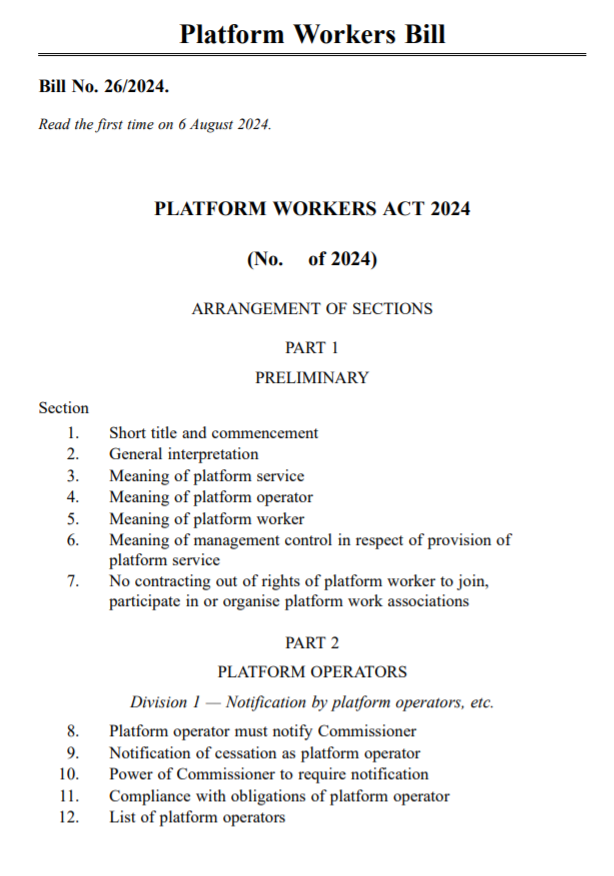 ●新加坡《平台工人法案》目录。图源:新加坡国会网站