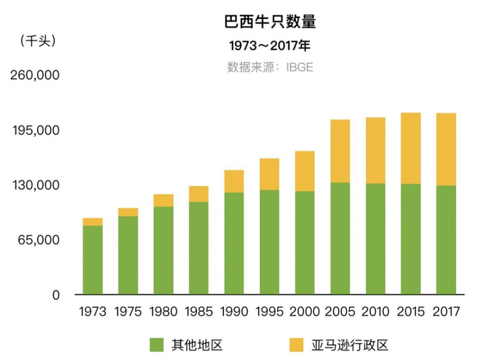 蚕食雨林的不只是大豆田,还有牧场。巴西国家地理统计局(IBGE)数据显示,1970年代至今,随着国内外牛肉消费量的增加,巴西养牛规模翻了一倍,增长量几乎全部来自亚马逊地区。