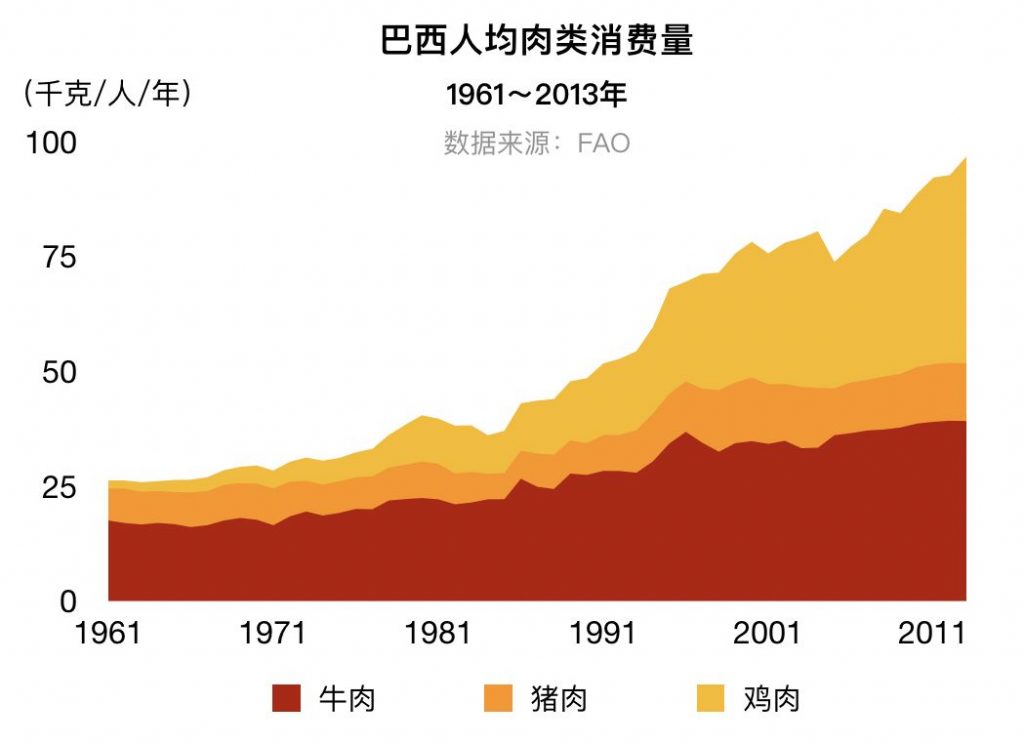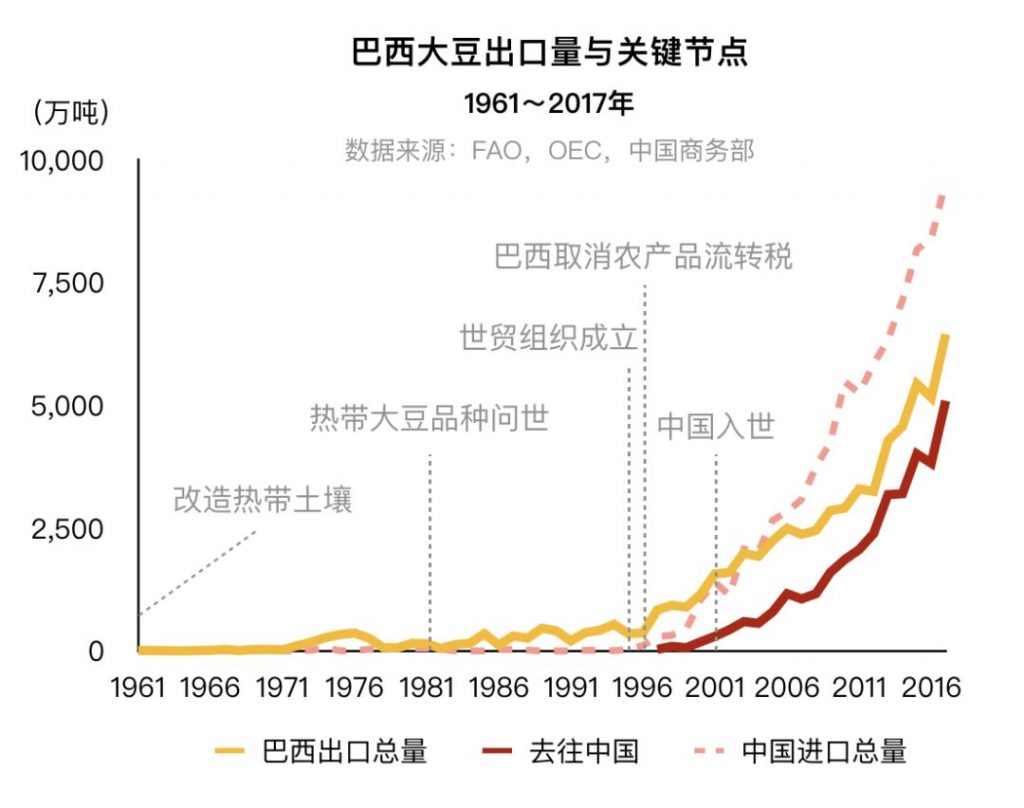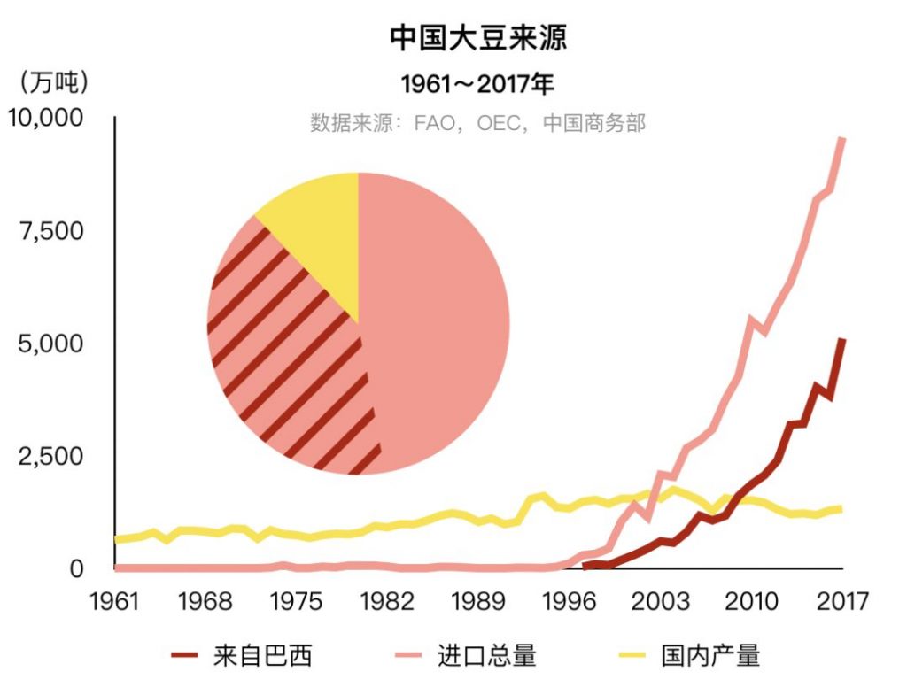 在那个敞开国门、快速发展的年代,我国农业部的领导曾反复指出,让中国人“吃上肉、多吃肉”是他们的工作目标。1990年代中期,中国放开大豆进口,以满足植物油和饲料需求。2001年,中国加入WTO,并在同一时期先后与美国和巴西签订了双边贸易条约,从此大豆进口量一飞冲天。到2017年,巴西出口的大豆,80%都运往中国,也才将将够填饱中国胃口的一半。