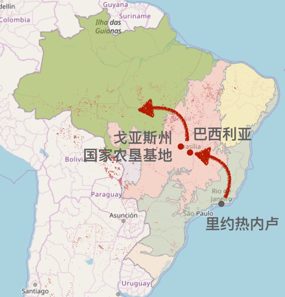 尽管如此,1941年,政府还是在塞拉多草原中央的戈亚斯州(Goiás)建成了进军西部的第一个据点——“戈亚斯州国家农垦基地”(CANG)。战后,西部开发的脚步越来越快,1960年,连首都也给搬来了——高管政要们告别港口城市里约热内卢,跑到塞拉多草原上生生开发出了一个全新的城市——巴西利亚,跨度约等于从南京迁都北京。