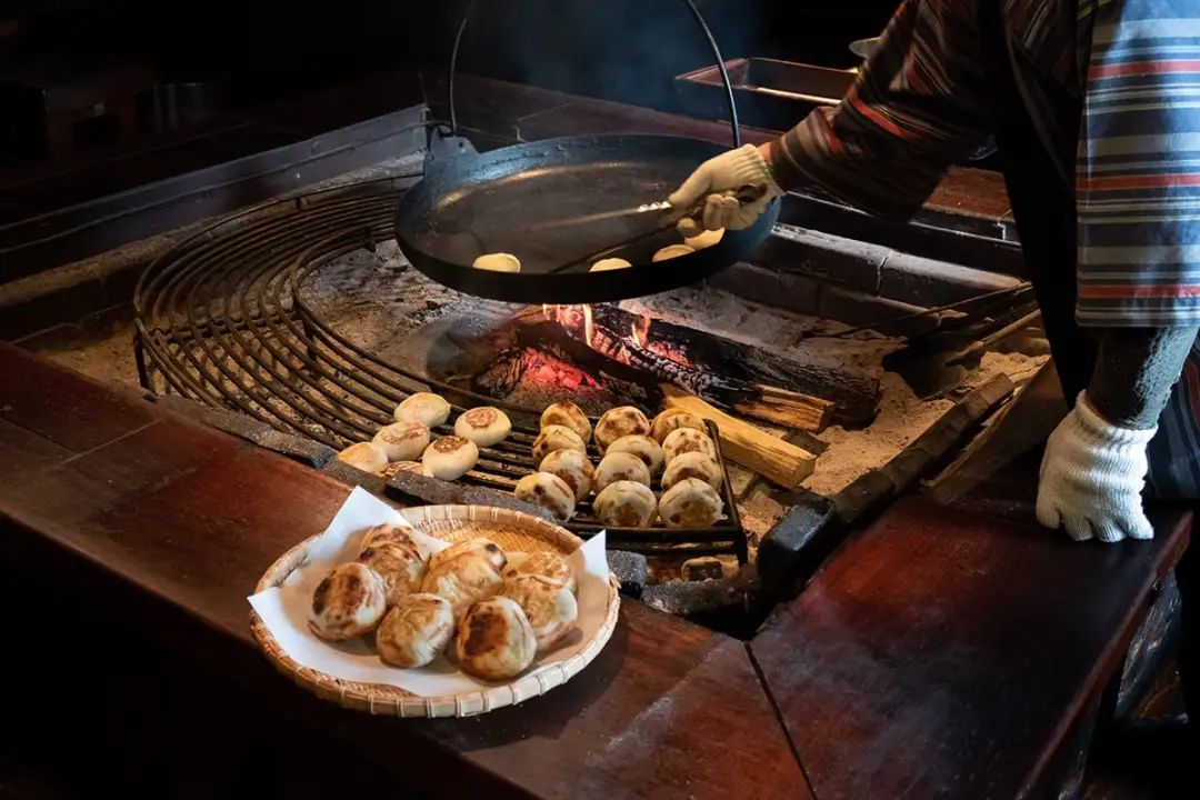 荞麦和面擀皮后包入腌菜(野沢菜)、味噌茄子或南瓜泥等馅料,在火上烤熟的“烤荞麦包子”(おやき),在长野县也很受欢迎,人们围炉烤制荞麦包子,度过漫长的冬日雪季。
