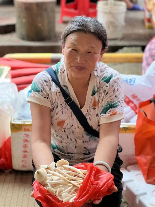 55岁的阿凤作为本地小农,每逢赶集就售卖自己种的蔬菜。夏至时期,她的摊位上多了用红色塑料袋兜着的夏至菇,突出的颜色像在告知来往的顾客“本季热销靓货在此”。
