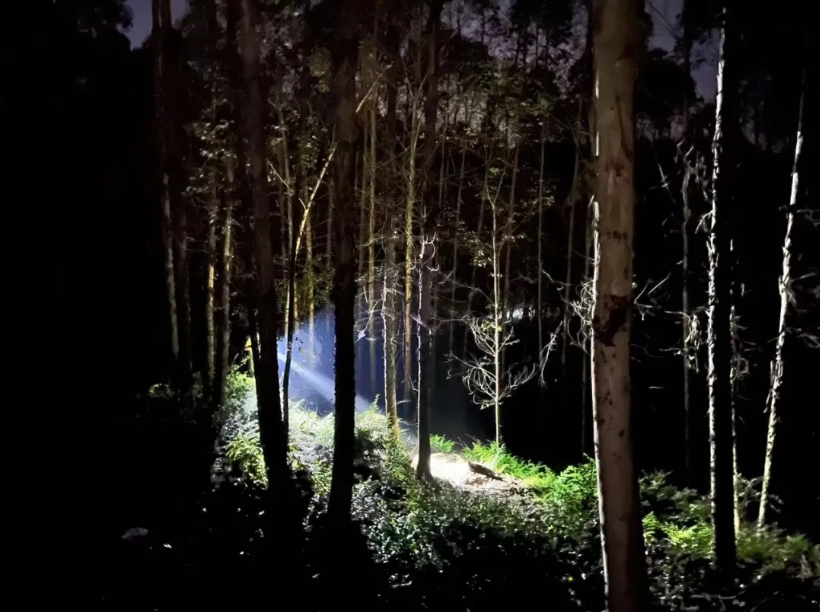 ●作者手持探照灯,凌晨在桉树林里寻找夏至菇。