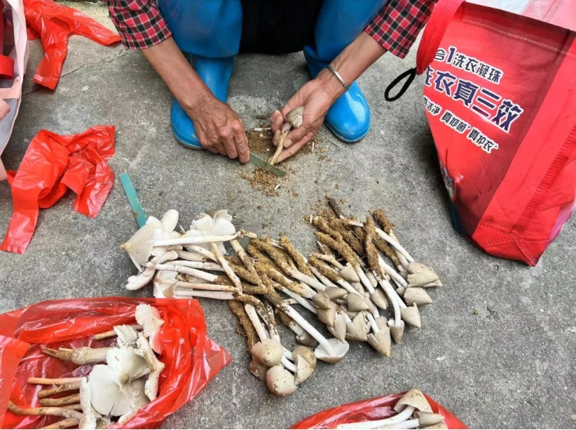 2024年,巧芸有孕在身,无法深入丘陵和野地,便在家门口散散步,没想到偶遇一窝夏至菇。“就长在草丛里,与机场只有一栅栏之隔,长得很肥美。”而巧芸母亲,则在自家的香蕉树下采了好几窝,她们母女都第一时间把夏至菇卖给收购商。