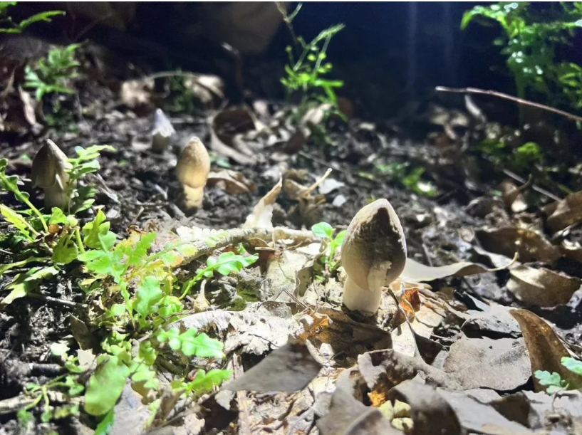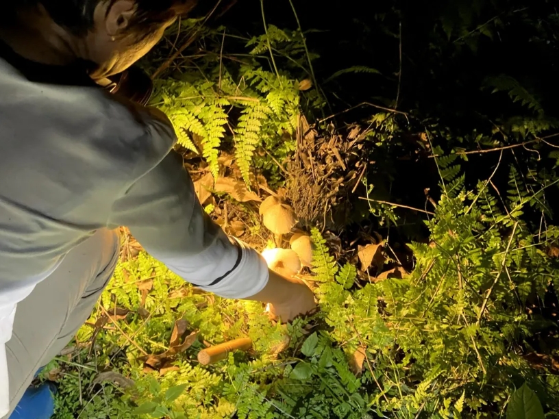 “白天比较热,而且容易遇到蛇。傍晚就有人出门找。但大多数人晚上才出动,一来没那么热,二来比较容易找,因为探照灯在夜里一照,看到反光,大概率就是夏至菇。有些人凌晨才去采,直接通宵,那得胆子大,因为晚上特别黑。有次我和我妈不小心去到坟头采菇,吓死了。”