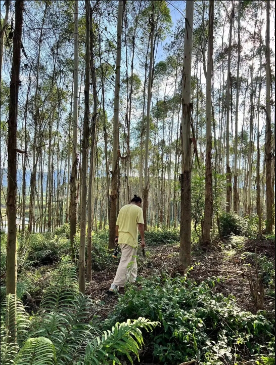 巧芸因为孕晚期无法随行,秀萍夫妇忙着收购菌子,我们便打算独自在树林里跟同行者取取经。然而,路上遇到的采菇人对我们都十分警惕,大多保持着适当的距离,不互相打扰或跟随,这仿佛是一种默契。最终我们远离人群,翻了两座桉树林小山头,才采到十三朵“子弹头”夏至菇。