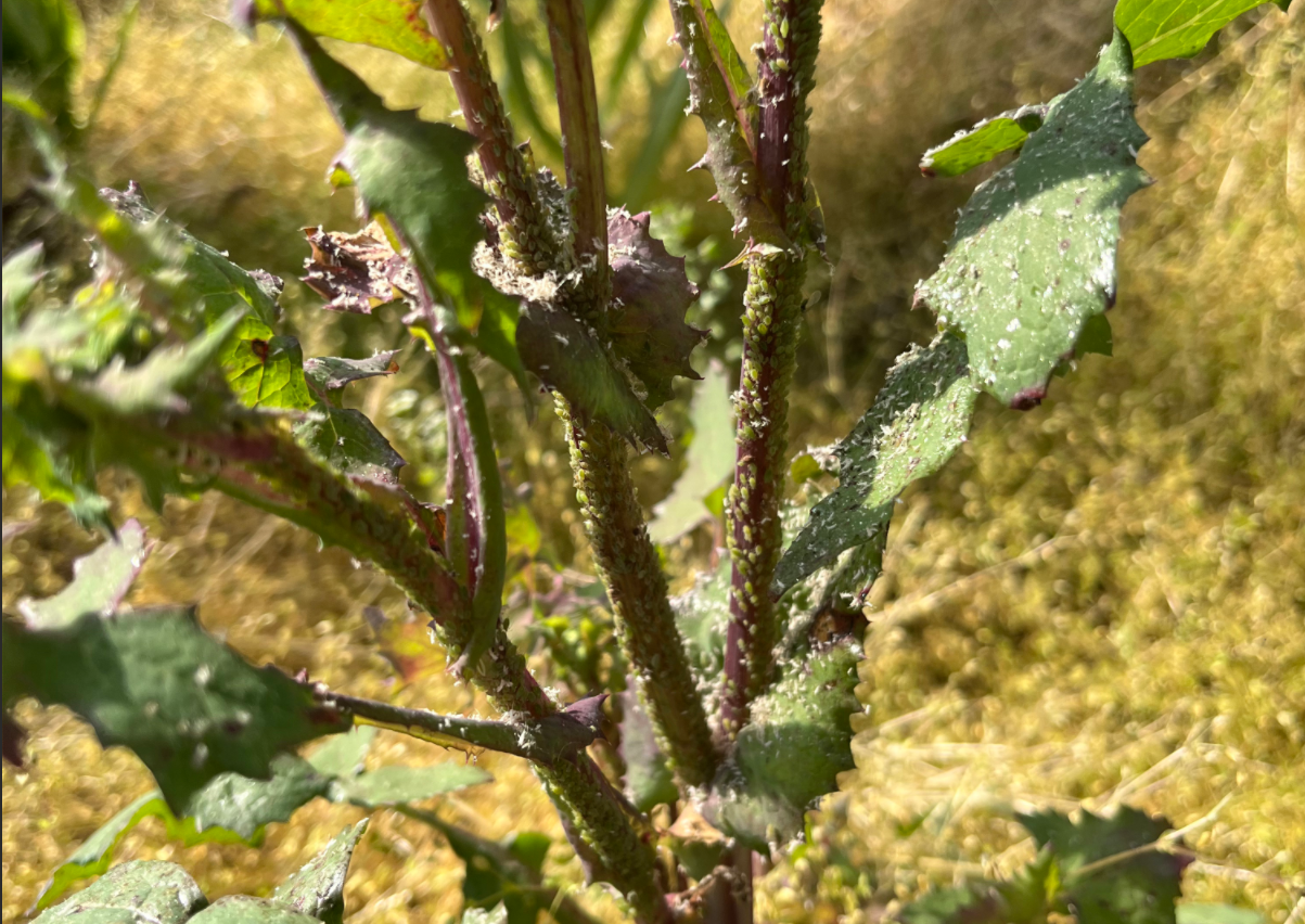 苦苣和泥胡菜也是地里常见的野草,三月末第一次在苦苣的茎干上看见密密麻麻的蚜虫;时隔一个月后,在同一片苦苣丛里,惊喜地发现七星瓢虫的幼虫开始孵化。一方面因为蚜虫对苦苣与泥胡菜的偏爱,弱化了其对农作物的侵扰;另一方面,蚜虫的天敌七星瓢虫也在这里找到了宜居的空间。