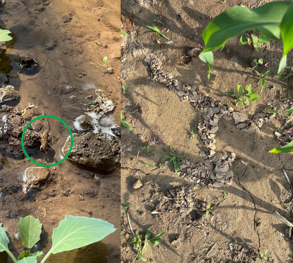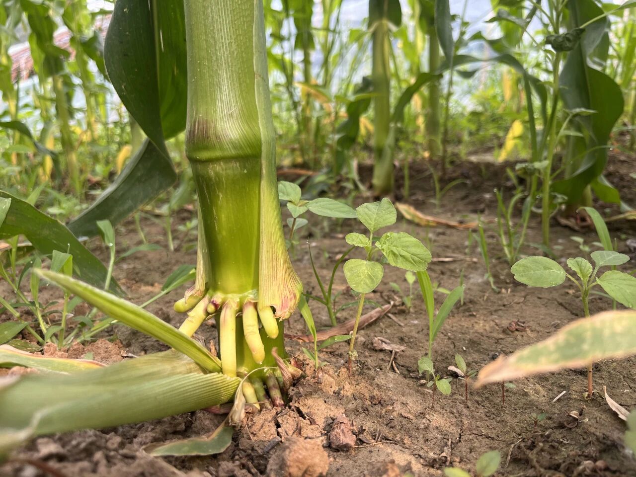 日常的巡地途中,发现在玉米田里,一块田畦边缘的土壤发白发干,邻边的土壤却依旧湿润。发白的土面周边没有野草的遮挡,而湿润的土面附近则生长着到膝盖处的反枝苋,卵形的叶片层叠着展开,护出底下一小片荫凉地带。