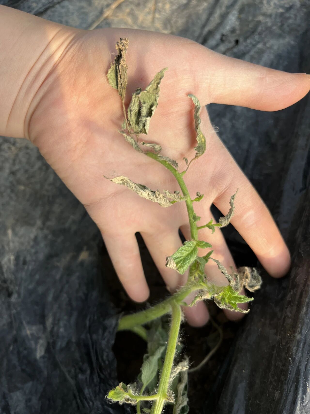 掐掉几株健壮番茄苗的腋芽后,将它们扦插到土里,每天早上会浇一掊水,等待它们生根成活。头几天扦插苗斜卧在地上,叶子逐渐凋零,无精打采,一副命不久矣的样子。又过了几天,眼看叶片的上半部分逐渐蜷曲枯干,同片叶的下部位开始长出新生的翠绿,每一片叶子都叙说着死亡与新生交汇的故事。