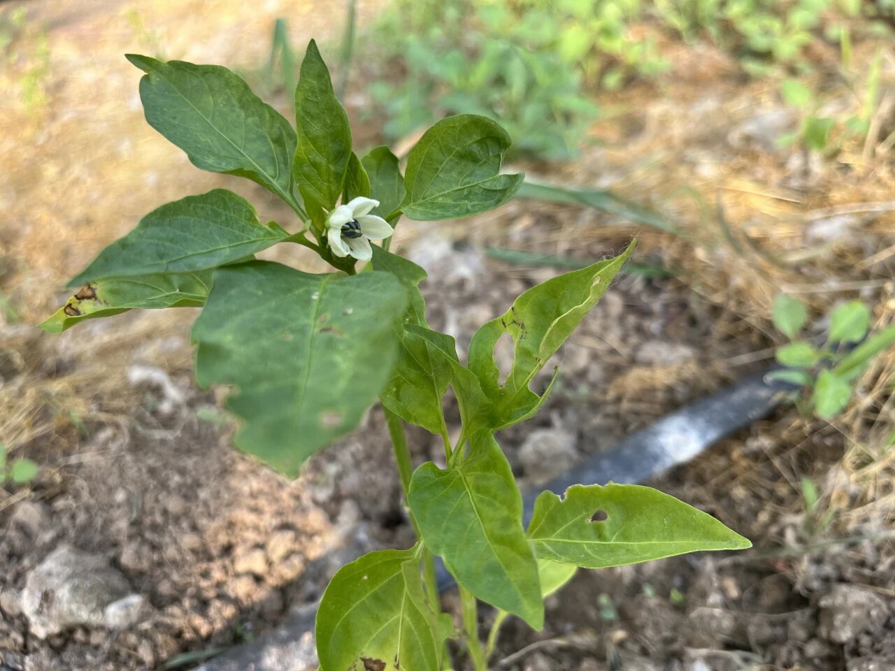 一株长势矮小、叶片发黄的柿子椒苗儿率先开了第一朵花儿。它的生长环境与其它尚未开花的苗儿比起来相当恶劣——生长在大棚的边缘地带,光照强烈,土壤失水迅速,时常处于缺水的状态是造成它长势不良的关键原因。植株早早意识到了这一点,于是它选择将本应供给于茎叶生长的养分转而作用于生殖生长,分配有限的养分率先开花结籽。