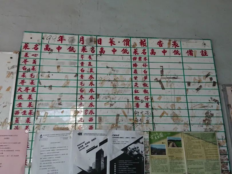 ●菜联社古洞分社的菜价报告表,摄于2019年2月。虽然白板上的时间定格在1999年,但这个菜站依然运作至今。对于非有机耕作和规模稍大的农场来说,菜站统销是重要的保底之选。图片:泽恩