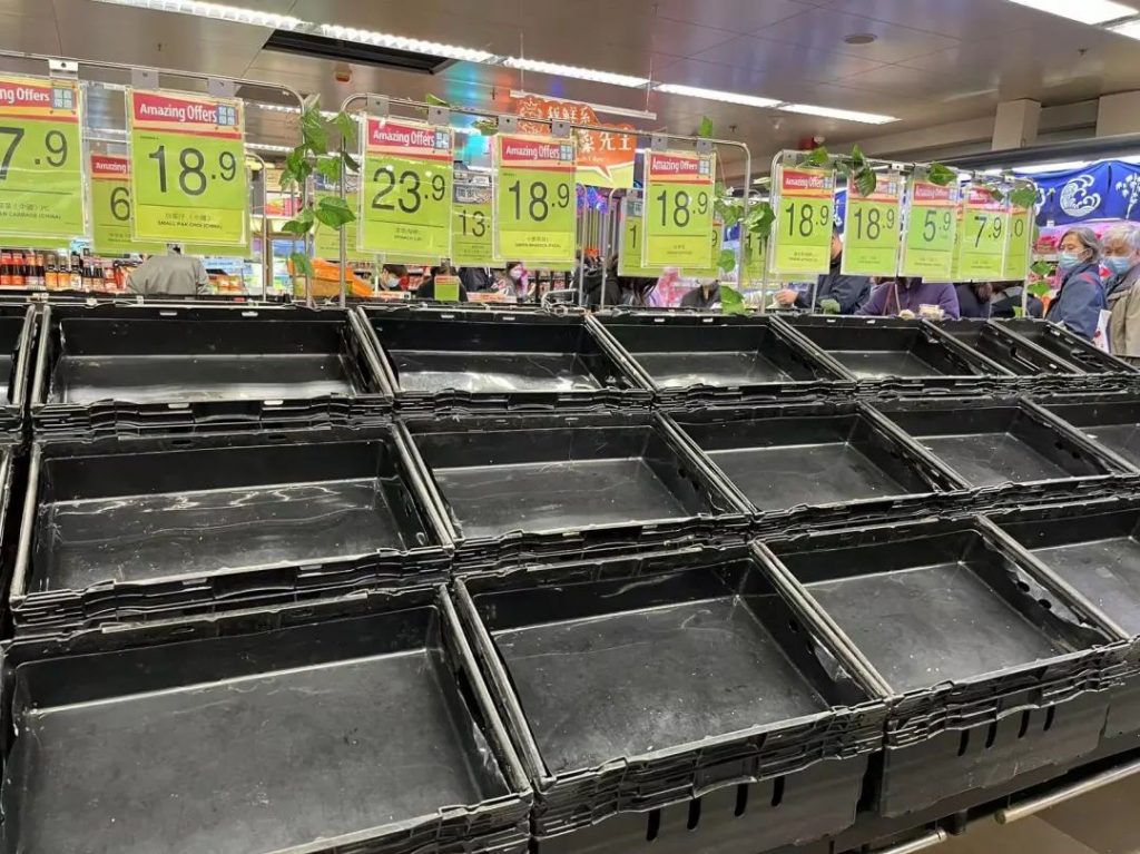 ●2月28日,香港新增新冠确诊病例将近2万,超市菜架被抢购一空。图片:食通社香港读者