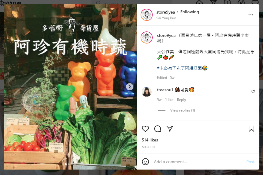 本地农场还收获了一些意外的关注。比如深水埗的一家旧物商店story9yea就卖起了有机菜。原来种菜的农夫就是店主Ellen的妈妈。这样不仅可以帮忙卖掉自家吃不完的菜,也让慕名前来打卡的人多了一个了解本地菜的窗口。