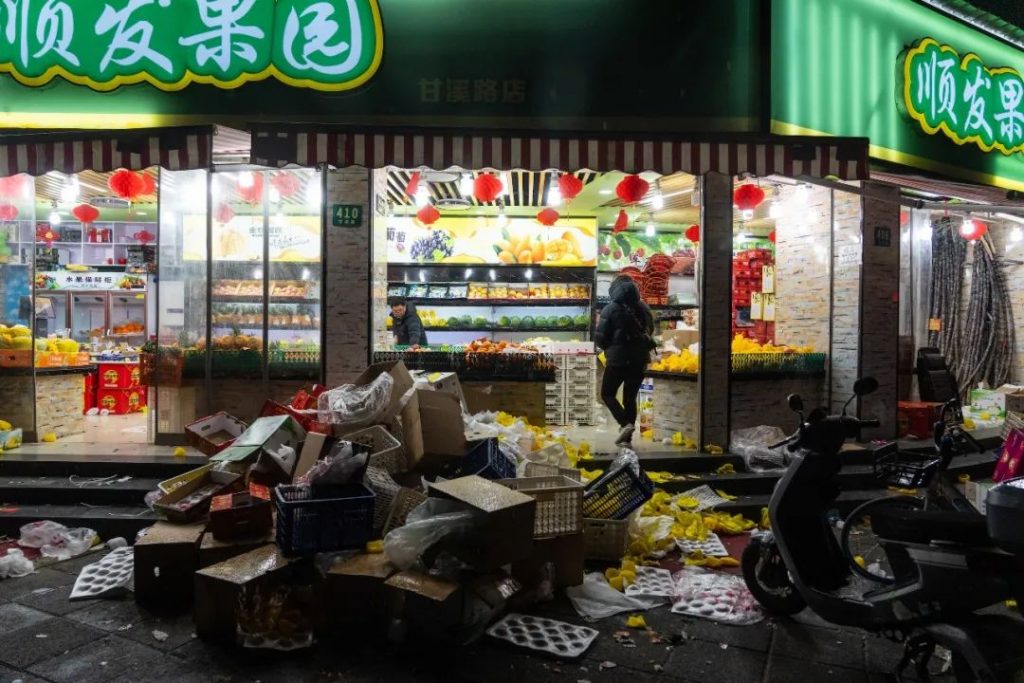 ●3月22日深夜,被抢购一空的浦西某菜店。图:高尔强