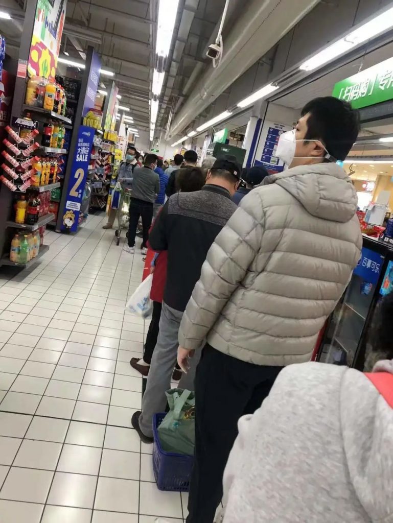 我在的那些微信群里,不管住浦东还是浦西,能出门买菜的朋友都瞬间出门了。我家附近没有病例的小区也临时开放,放大家出门采购。上海的大超市昨晚都延迟到12点关门,地铁也是。朋友圈里都是各大超市里人山人海抢购的视频,有个拍视频的姑娘讲:“这看上去不是要封四天,而是要封两年。”大家在慌乱中也顾不上保持距离,又都只戴着普通的医用口罩,简直是加速病毒传播的良好时机。