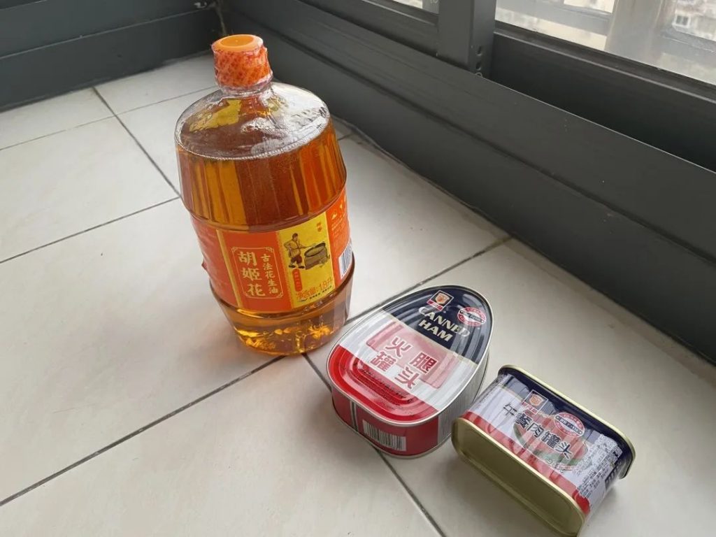 今天收到第二批援助物资,两盒罐头肉和一罐花生油。还说要发莲花清瘟。邻居们在业主群里关照说:没病别乱吃,会腹泻。