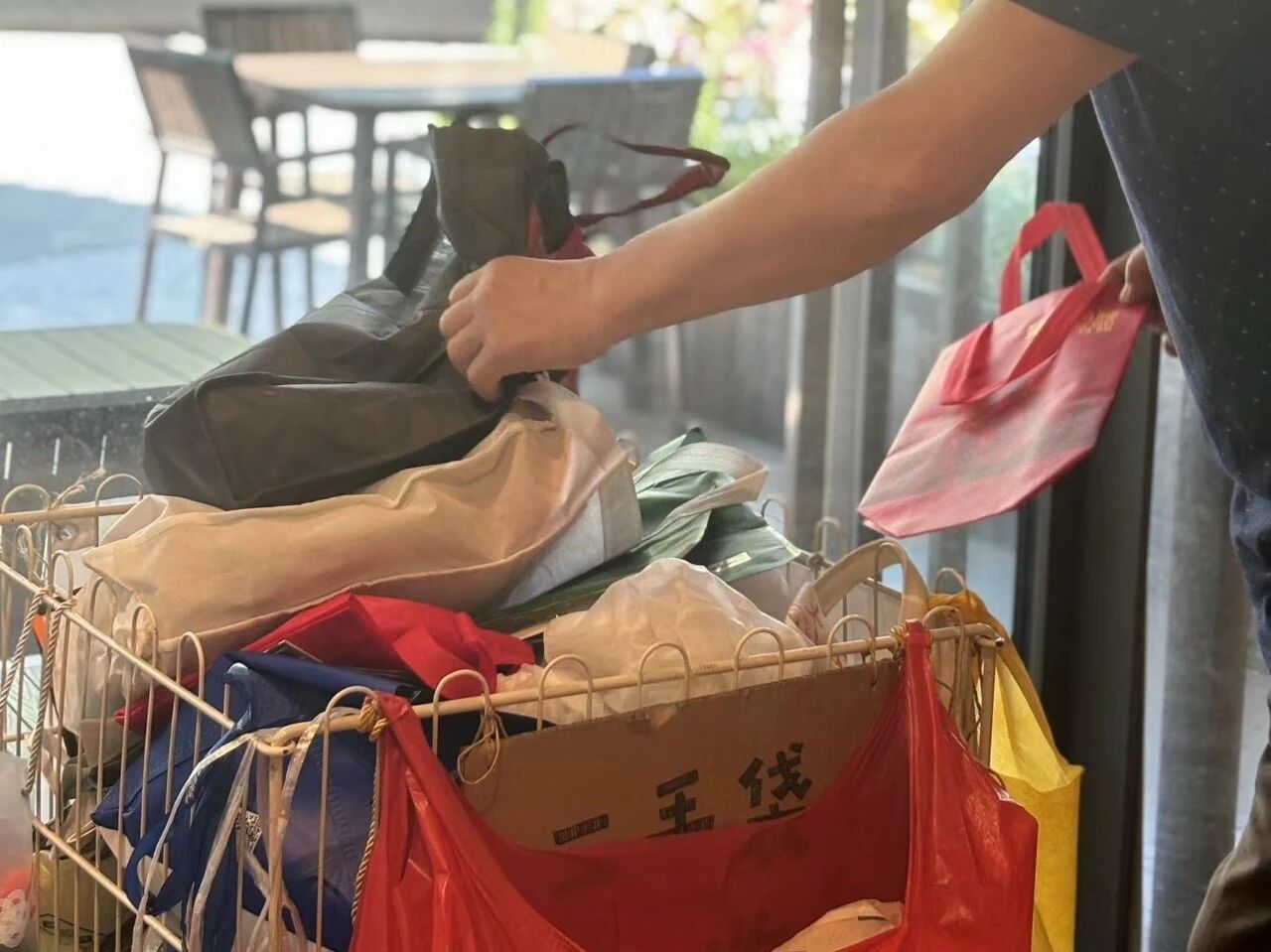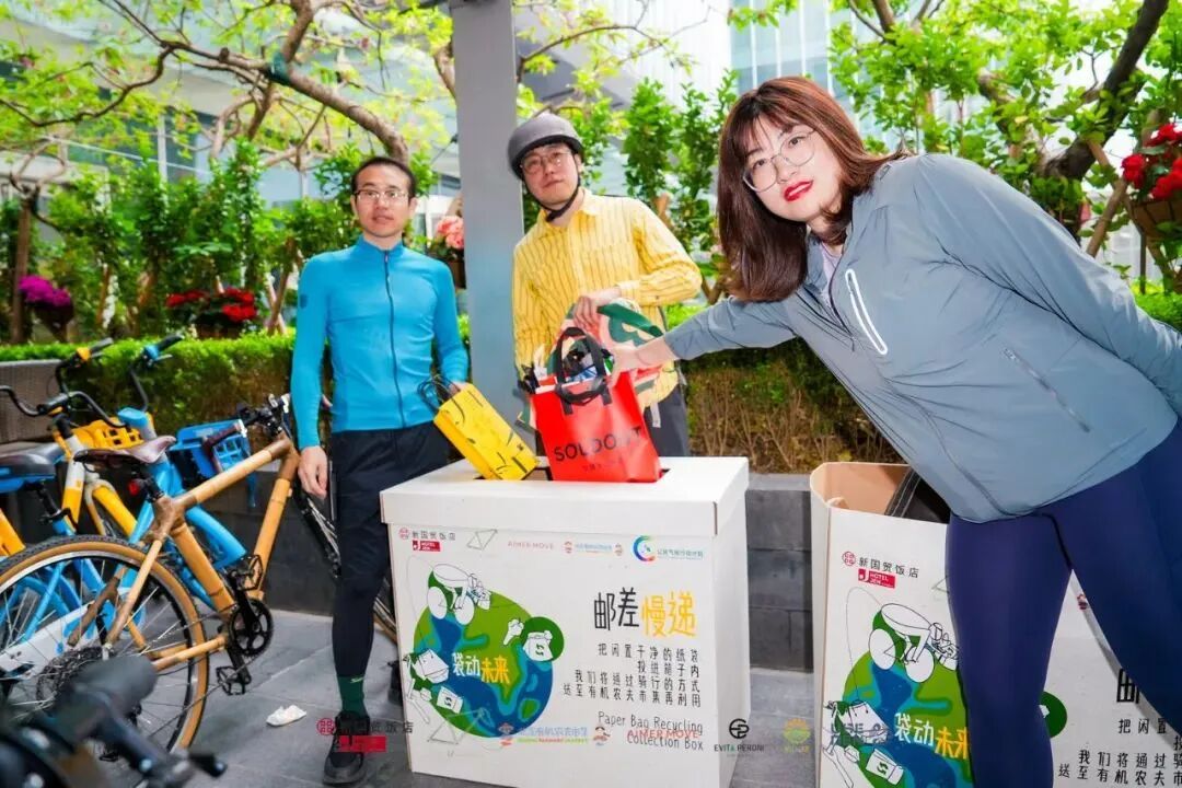 ◉Free U Nature发起的“邮差慢递”的活动,正是通过骑行让二手袋子流动起来,给有需要的商家使用,从而减少塑料包装的消耗。图源:Free U Nature