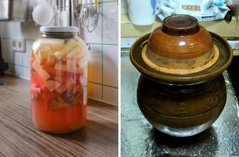 今年回老家,从娭毑(湖南方言,对老年妇女的尊称,一般指祖母、外祖母)的朋友处获得了一瓶她养了20多年的老坛子水。回德国后立马把它倒进了我的泡菜坛子,给我的坛子续上了她二十年的寿命。在长沙吃惯了大蒜、藠头、长豇豆、白萝卜的乳酸菌们,在柏林被我养出了欧洲防风、茴香、苤蓝还有樱桃萝卜的胃口。饮食多样化的坛子越养越香,也越来越好打理。