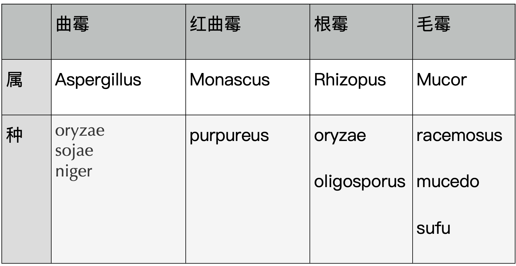 各种霉菌有自己的俗名、商品名,穿梭在母语和外语之间,常常让我感到眼花缭乱。我习惯为自己总结一个分类表格,列出不同菌株的拉丁名,辅助我来认识不同霉菌家族和各自长处。