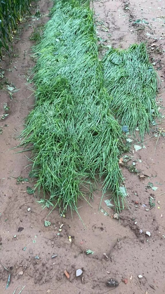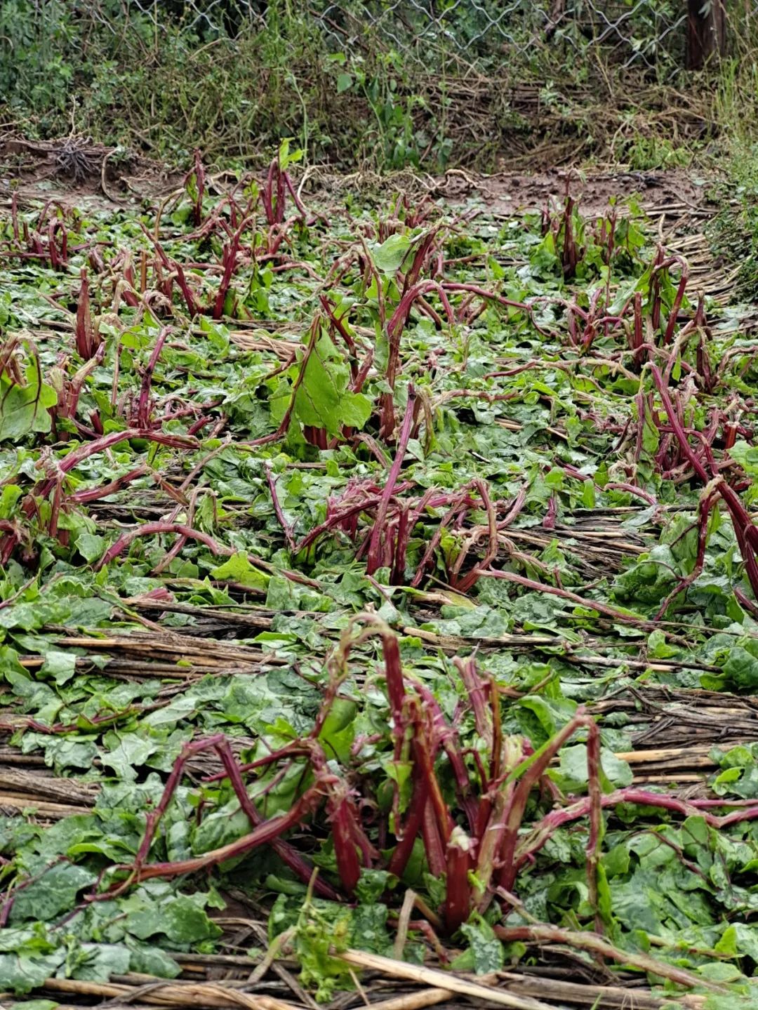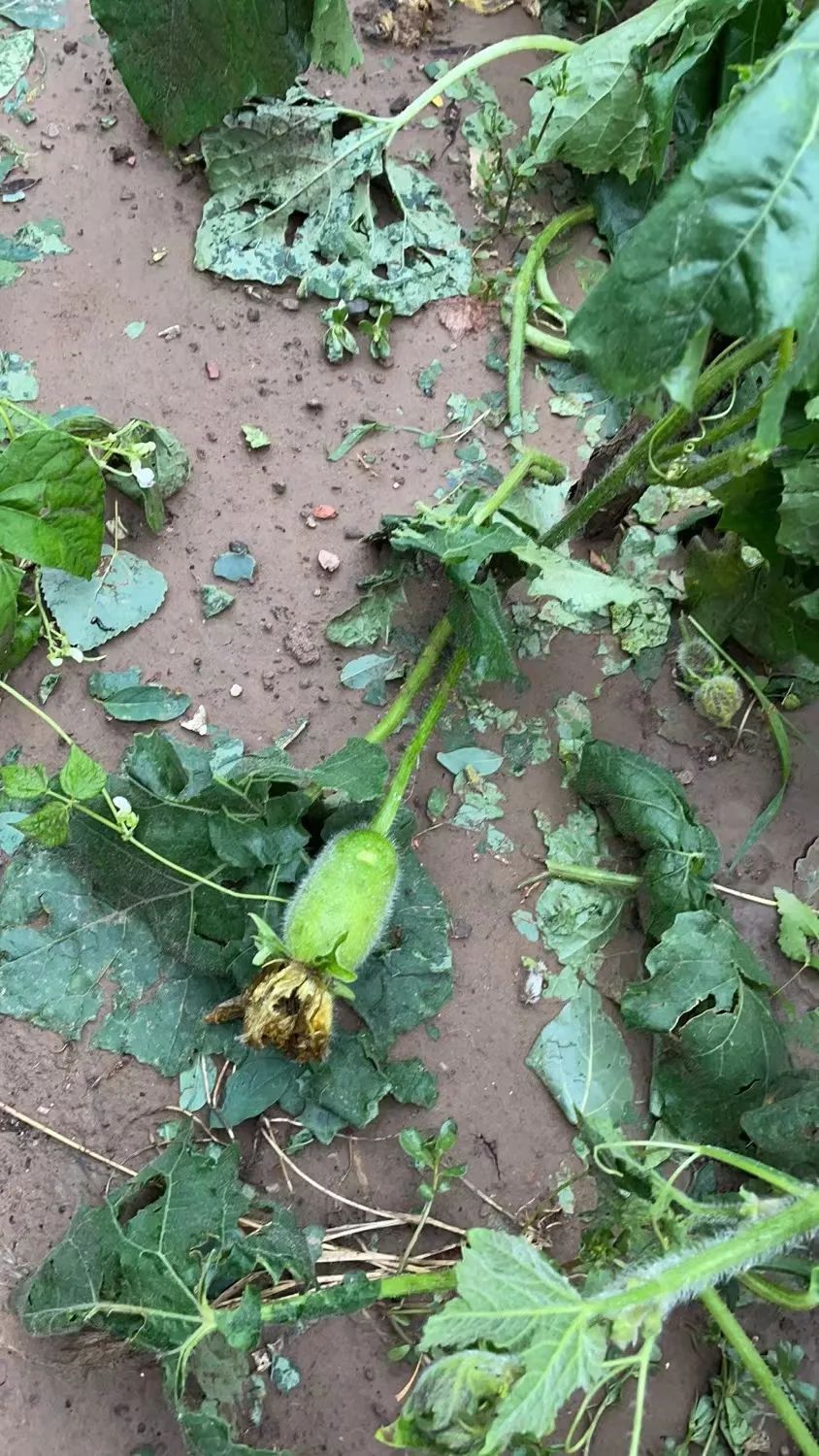 叶菜几乎无一幸免地匍匐在地里,正在坐果的瓜连着藤蔓被打到地上,快成熟的西红柿和黄瓜皮开肉绽。连长在地里面的土豆也被大冰雹砸得露出地面,土豆皮甚至也被冰雹给刮开了。