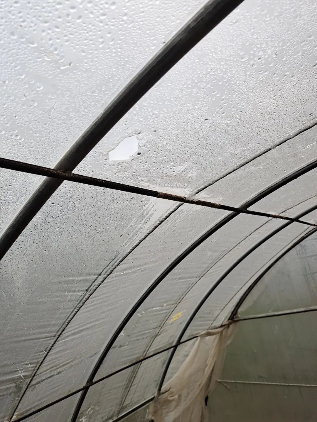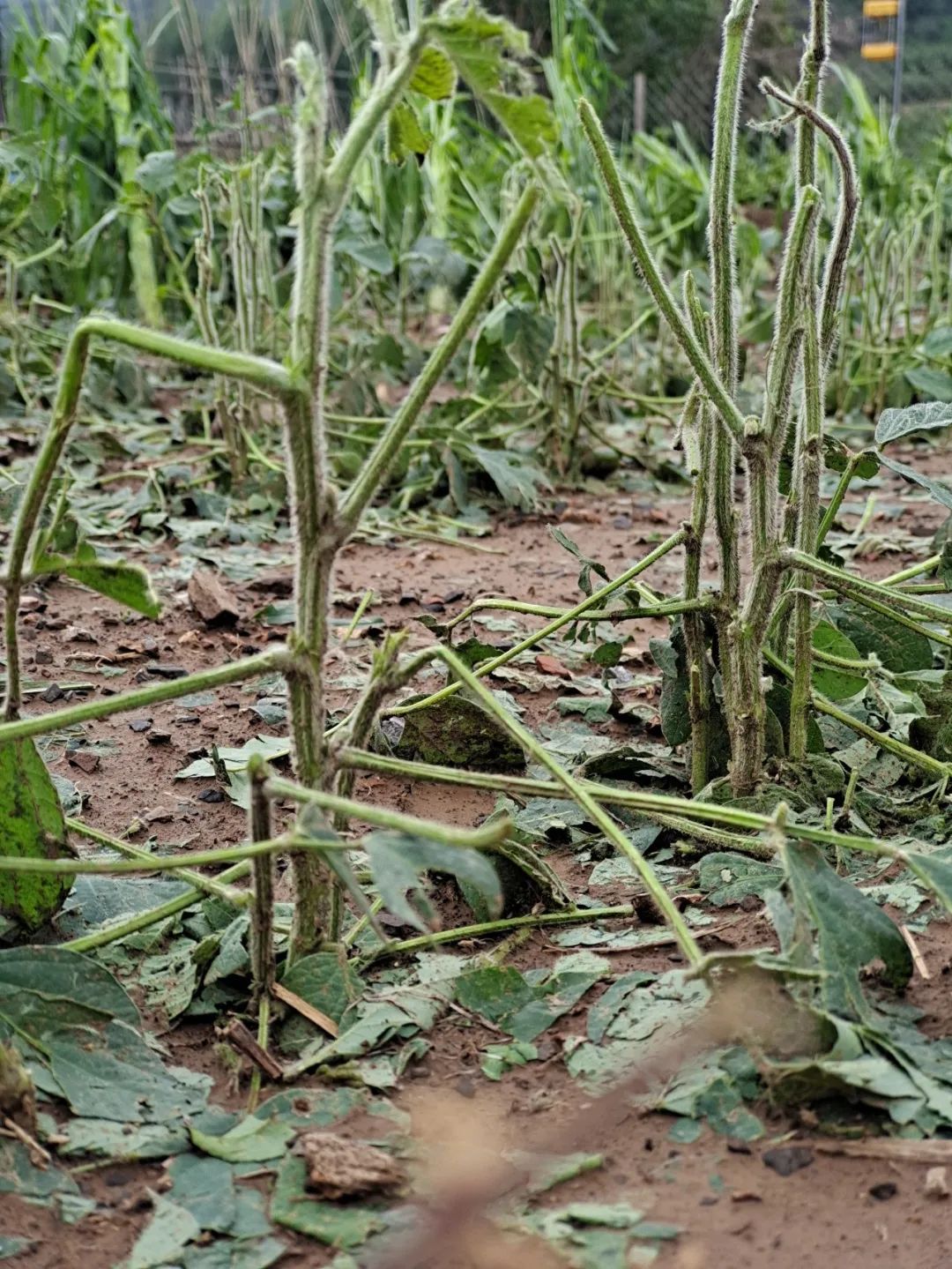茄子和西红柿被击碎;甜菜和生菜的大叶子被砸烂;露地栽培的黄瓜,只剩下主枝还挂在架子上;大豆残留的茎,倔强而孤独地支棱着;塑料大棚的薄膜,被砸出个洞。