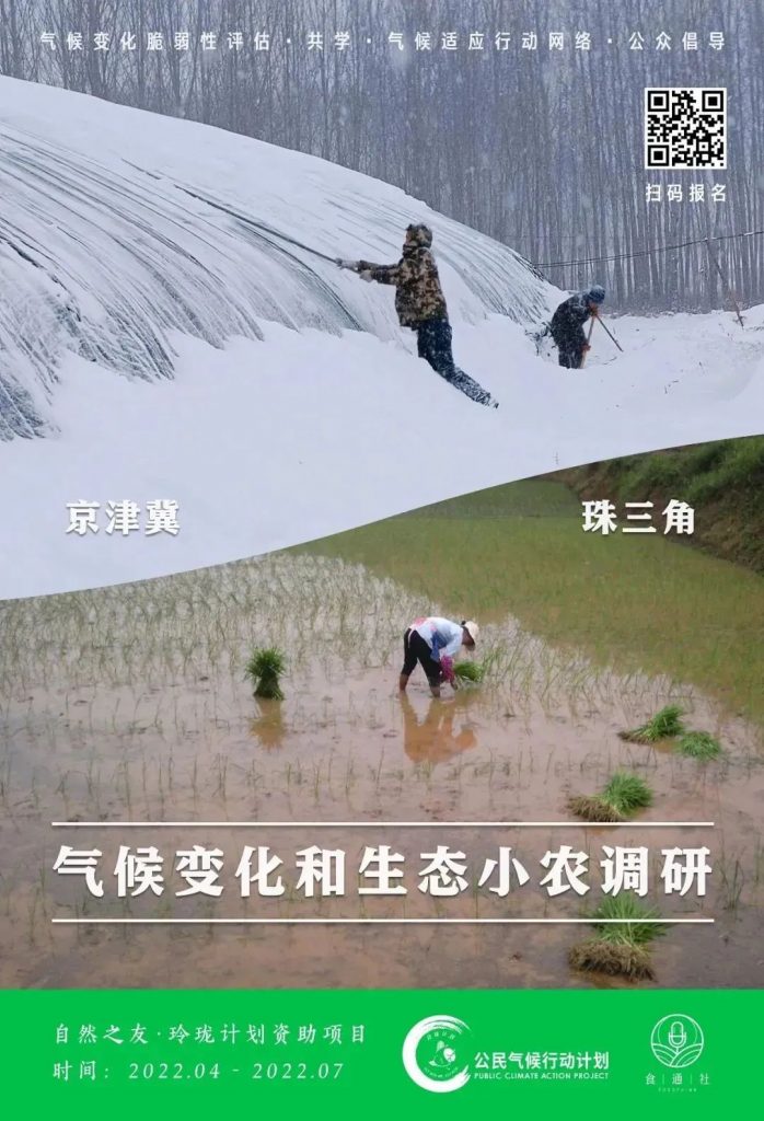 在这次参与式调研中,项目组将以京津冀和珠三角两地为核心,走访调查30户生态小农,最终形成调研报告。我们希望能帮助农户认识气候变化对农业生产的风险,学习、分享、总结在地的气候适应方法,记录下他们应对气候变化的故事。同时,我们还将通过线上线下工作坊,邀请专家为农户剖析气候变化对农业的影响。