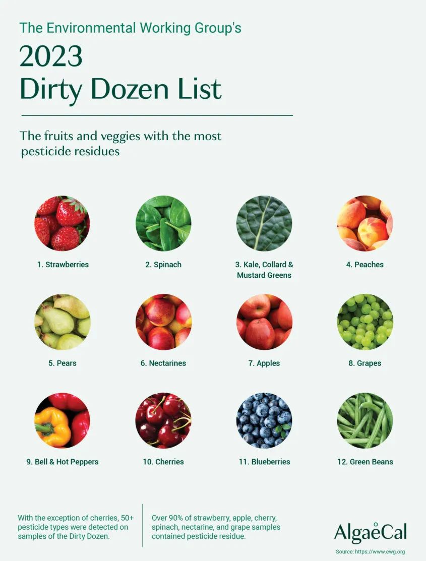 ●美国环境工作小组(EWG)整理制作的“2023年最脏的20种水果”清单。常规草莓因农残检出种类最多而多年蝉联榜首。图源:网络