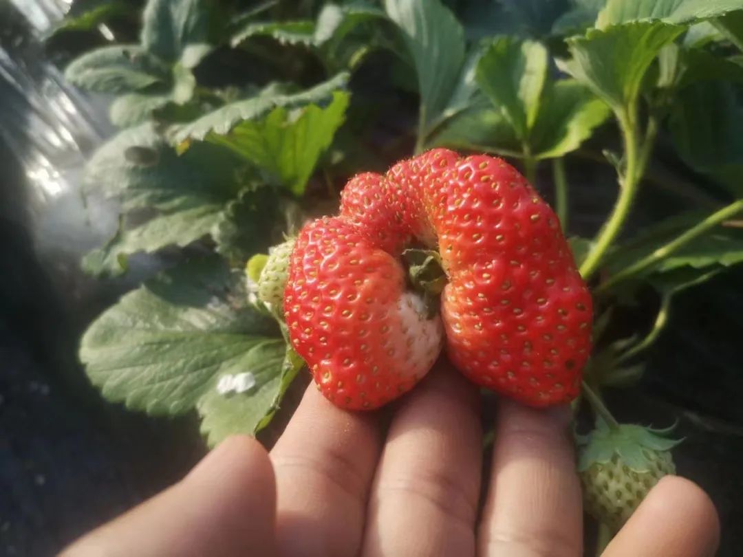 看重颜值的消费者可能不知道,溪青农场的畸形果更甜,原理是植物的营养补偿效应,比如这颗长成扇形的草莓。王鑫推测,它的畸形和去年11月的低温有关。
