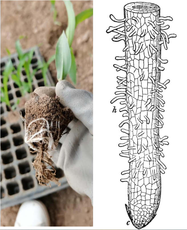 ●玉米苗的白色根部,有一圈细细的白色绒毛,这就是根毛。根毛结构图来源:维基共享