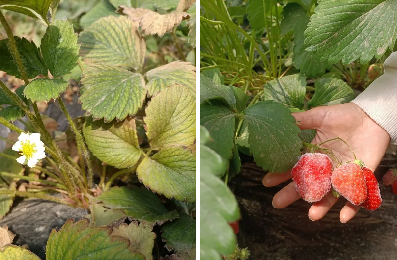 ●被红蜘蛛吸食的草莓叶;得了白粉病的草莓果。